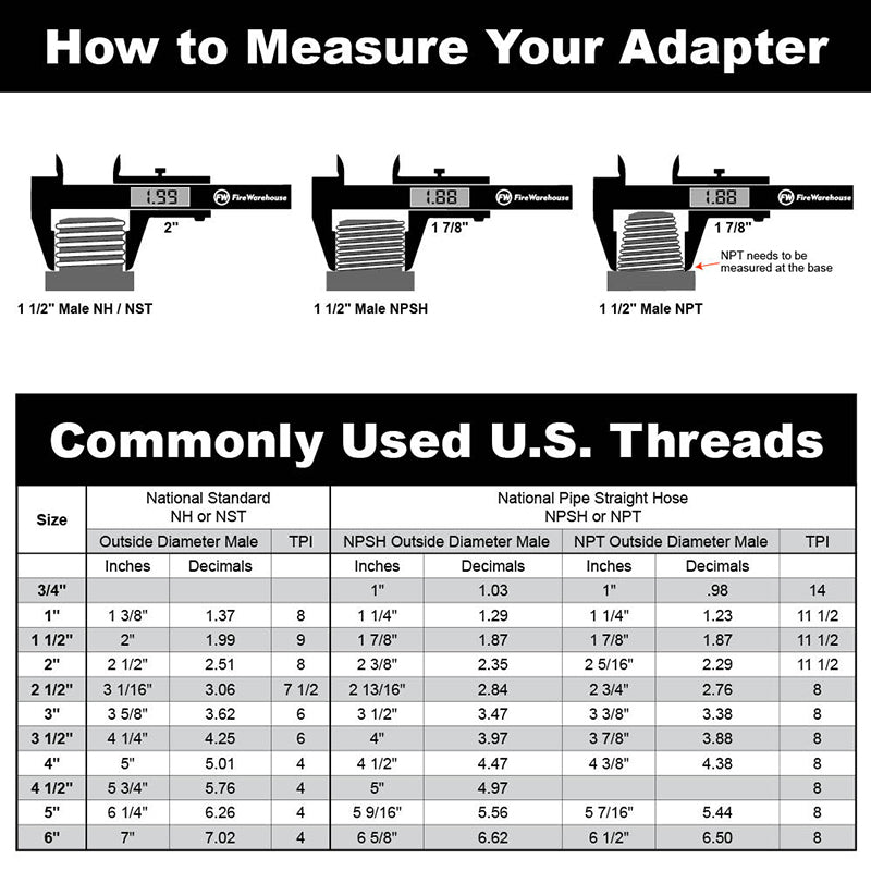 • Outside diameter of a male NH / NST adapter: 3 1/16 inches (3.06) - 7.5 Threads per inch
