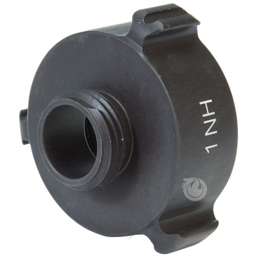Aluminum adapters are fabricated from seamless extruded 6061-T6 aluminum and hard coat anodized per MIL-A-8625 Type III, Class 1. Threads have a blunt start Higbee cut with indicators on adjacent lugs. Part identifications are permanent and stamped prior to hardcoat. Adapters and components meet the requirements of NFPA 1963.