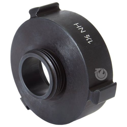 Aluminum adapters are fabricated from seamless extruded 6061-T6 aluminum and hard coat anodized per MIL-A-8625 Type III, Class 1. Threads have a blunt start Higbee cut with indicators on adjacent lugs. Part identifications are permanent and stamped prior to hardcoat. Adapters and components meet the requirements of NFPA 1963.