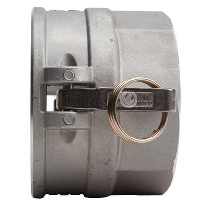 Global type "D" aluminum 4 inch female camlock (Cam & Groove) coupler to 3 inch female NPT threads.