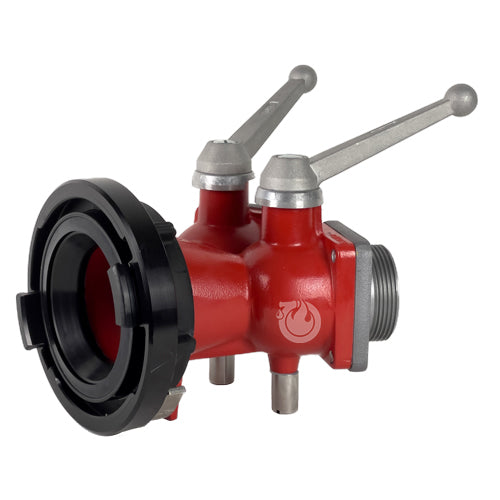 5 inch Storz female inlet x (2) 2 1/2 inch NH threaded male outlet ball valve. Standard color is silver/black. Custom threads are available. Material is aluminum. Features appliance support studs to help keep valve body off of pavement. Raised handles for maximum rotational clearance.