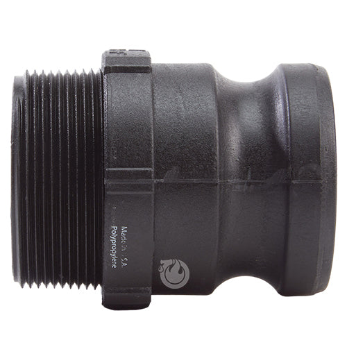 Type "F" polypropylene 2 inch male camlock (Cam & Groove) coupler to 2 inch male NPT threads.