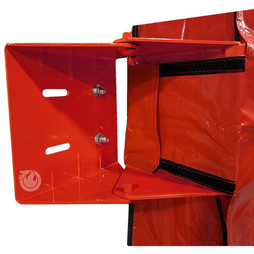 Swing type hose storage reel cover is bright red fabric reinforced PVC with velcro closures for quick release.