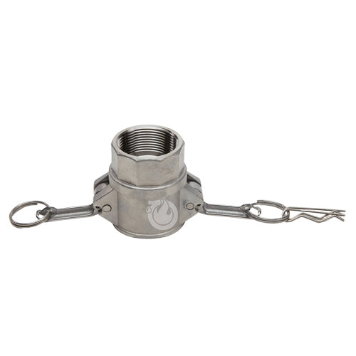 Global type "D" stainless steel 1 1/2 inch female camlock (Cam & Groove) coupler to 1 1/2 inch inch female NPT threads.