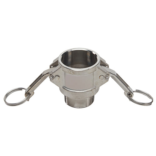 Global type "B" stainless steel 1 1/4 inch female camlock (Cam & Groove) coupler to 1 1/4 inch male NPT threads.