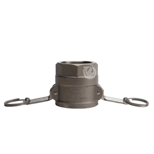 Type "D" stainless steel 2 inch female camlock (Cam & Groove) coupler to 1 1/2 inch female NPT threads.