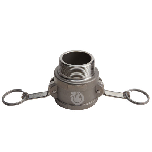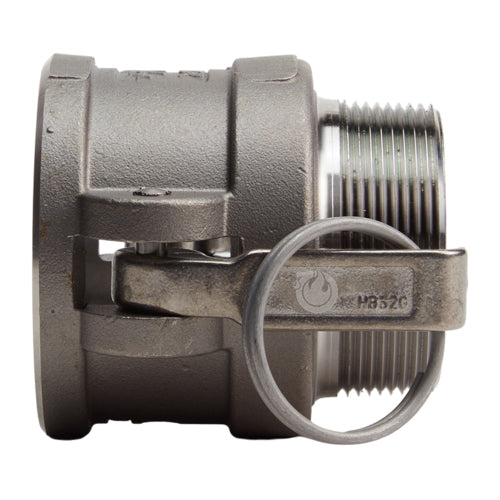 Type "B" stainless steel 2 inch female camlock (Cam & Groove) coupler to 1 1/2 inch male NPT threads.